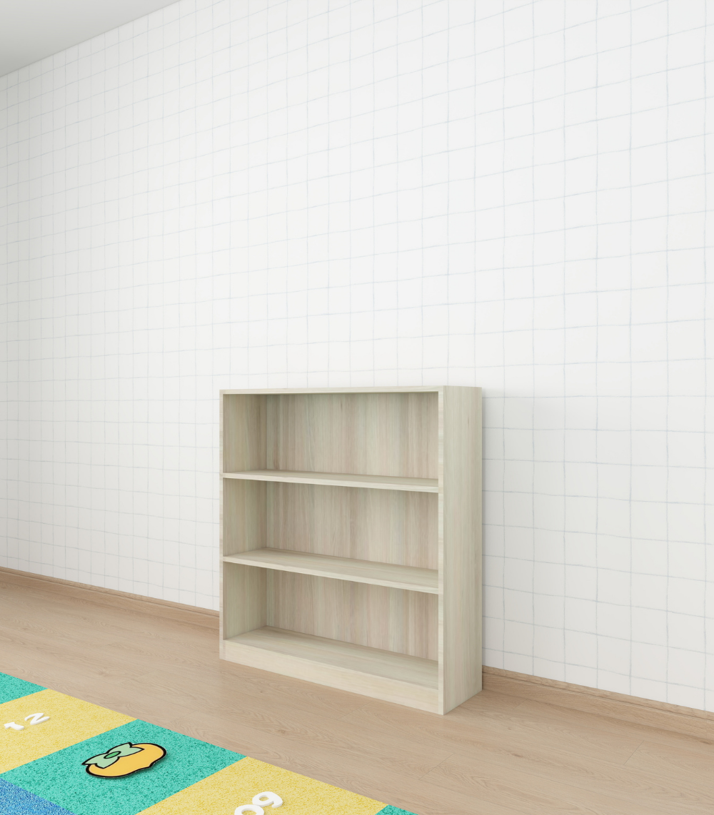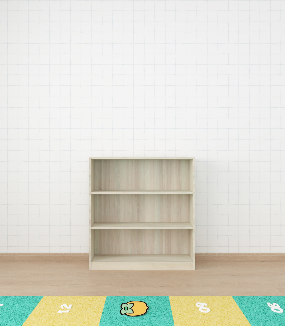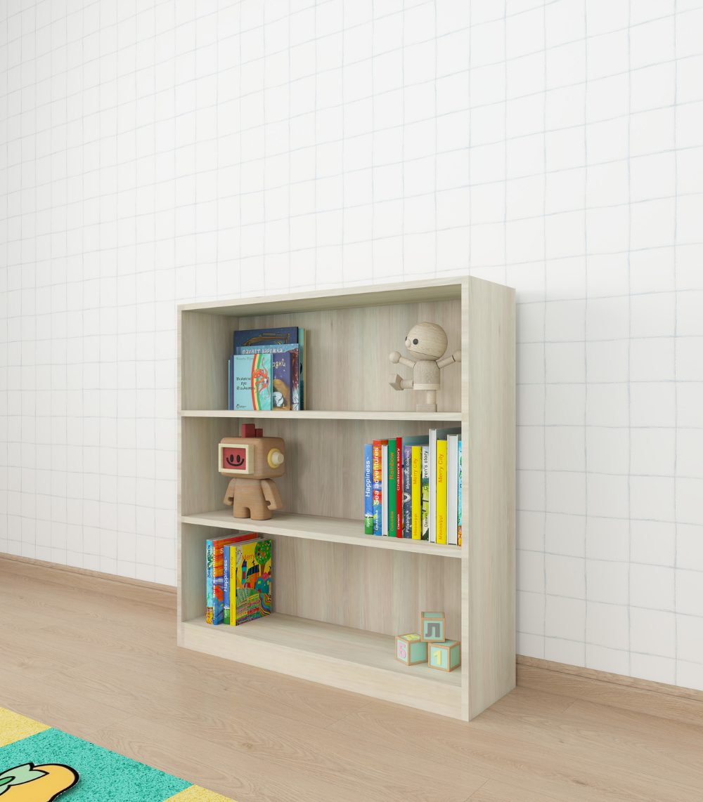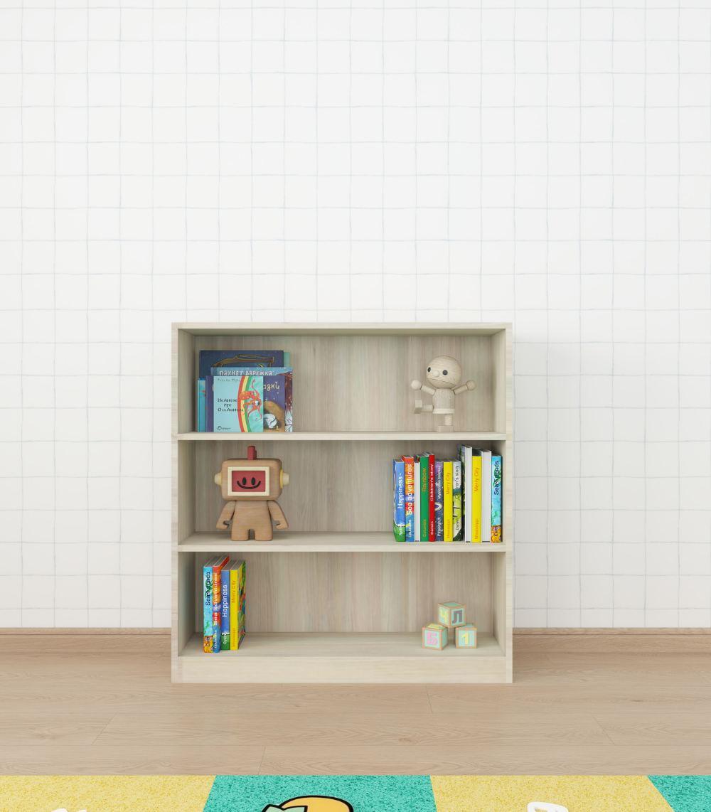 A low, open shelf that helps little hands reach their books and toys easily while learning to tidy up on their own.